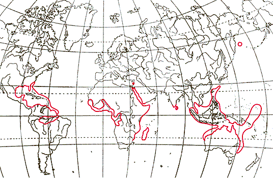 Ареал морских коров, или сирен, восстановленный В.Г. Гептнером с соавторами. Знаками вопроса обозначены места возможного обитания сирен в прошлом, а также участки ареала, по которым имеются сведения сомнительного характера. В восточной части Средиземного моря отмечено место захода дюгоня.