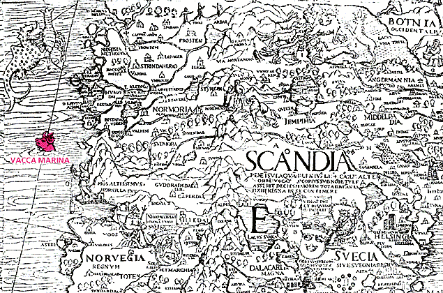 Есть и более поздние упоминания такого рода [13]. На карте О. Магнуса середины XVI в. в море около побережья Западной Скандинавии изображена голова плывущей обычной коровы, но с пояснением - Vacca marina (т.е. корова морская; сам же автор карты ее безусловно не видел).